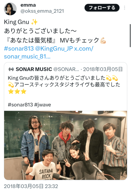 - King Gnuのライブ会場にemmaさんがいたという情報